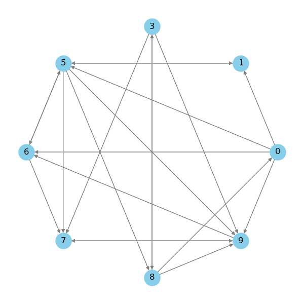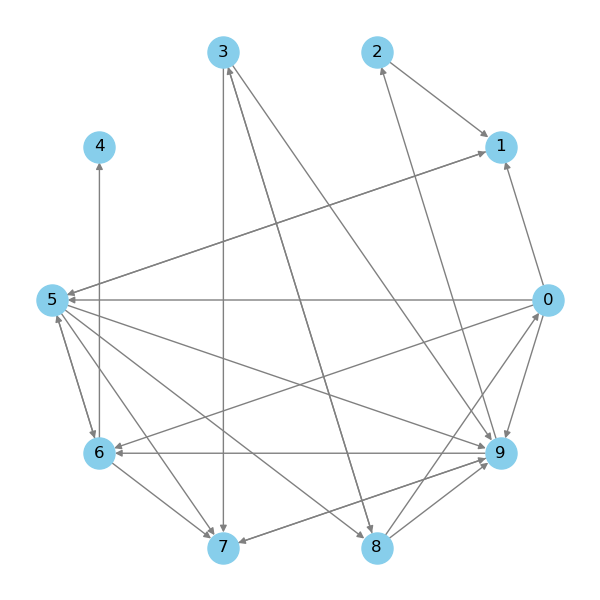 For example, let’s take a simple directed network of 10 nodes, where edges are created with a probability of 0.25. This will help us visualize how core analysis works in action!