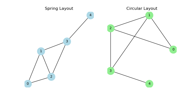 In this example, we’ve created a simple undirected graph and used two different layouts to position the nodes. This produces the following result.